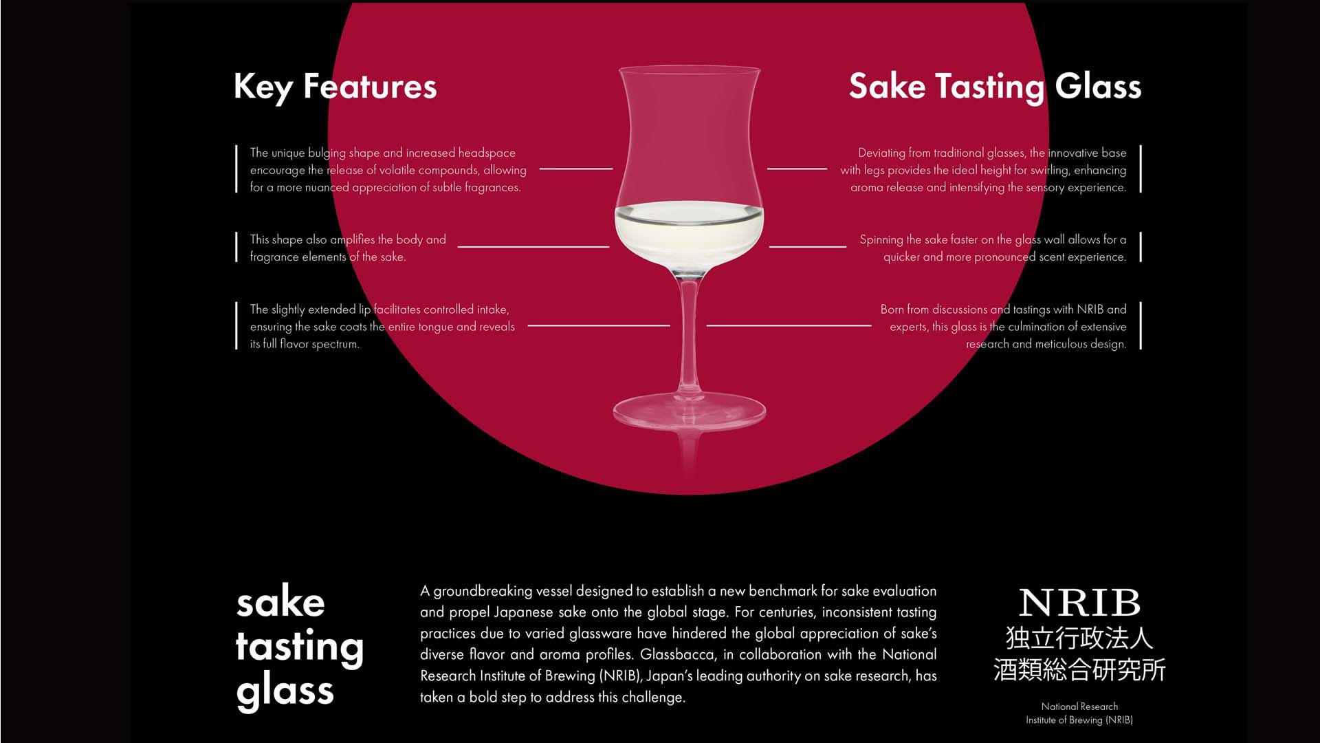 與傳統日本酒杯不同,是創新的杯梗設計,提供了理想的旋轉高度,增強了香氣體驗,再杯壁上快速旋轉清酒,也能夠更快地獲得更濃郁的香氣感受,這款酒杯源於NRIB和專家的討論和品鑑,是廣泛研究和精心設計的結晶
